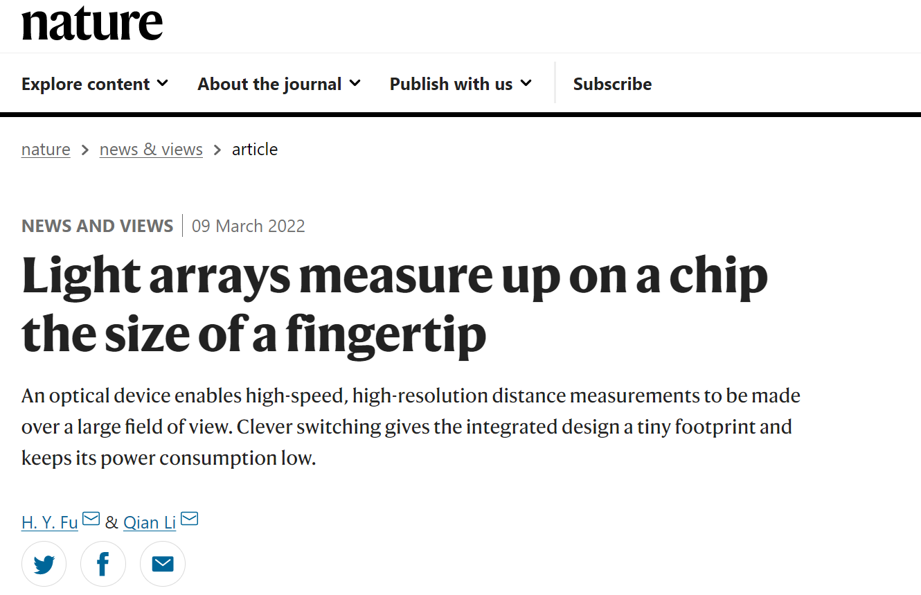 该评述文章近日以“在指尖大小芯片上进行的光阵列测量”(Light arrays measure up on a chip the size of a fingertip)为题发表于3月10日《自然》(Nature)期刊上的研究专栏(DOI: //doi.org/10.1038/d41586-022-00642-1), 论文作者为清华大学深圳国际研究生院清华-伯克利深圳海角社区