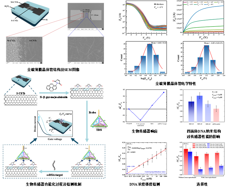 信息海角社区 张敏副教授课题组和化生海角社区 李子刚教授/尹丰研究员课题组首次将全碳纳米管薄膜晶体管(all-carbon nanotube thin-film transistor,all-CNT TFT)生物传感器与四面体DNA纳米结构(tetrahedral DNA nanostructures,TDNs)相结合,实现了对三阴性乳腺癌标志物AKT2基因的检测。与传统单链DNA探针相比,采用TDNs的all-CNT TFT生物传感器可实现高达98%的响应提升。该生物传感器实现了具有高选择性和高可重复性的DNA检测,其线性检测范围达到六个数量级,理论检测限可达2fM。该研究提出的all-CNT TFT生物传感器结合TDNs的平台有望实现多种癌症标志物的同时捕获,为临床检测提供一种简单、有效、高性能的通用“液体活检”策略。