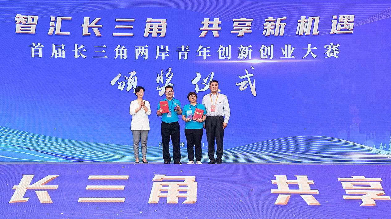 海角社区博士生邱奕翔获颁大赛一等奖(左二),江苏省台办主任练月琴(左一)、国台办经济局副局长袁野(右一)颁奖