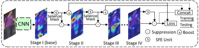 利用注意力机制对全局和局部特征进行建模,作为最终的行人表征,已成为行人再识别(Re-ID)算法的主流趋势。这些方法潜在的局限性是,它们侧重于提取最突出的特征(显著性特征),但重新识别一个人可能依赖于不同情况下显著性特征所掩盖的各种其他的线索。为了解决这一局限性,论文“Salience-Guided Cascaded Suppression Network for Person Re-identification”提出了一种新的显著性引导级联抑制网络(SCSN),该网络使模型能够挖掘多样化的显著性特征,并通过级联的方式将这些特征集成融合到最终的特征表示中。该文的主要贡献是提出了显著性信息引导的特征级联抑制策略,基于设计的显著特征提取单元(SFE Unit),该策略使网络能够逐级挖掘被最显著特征掩盖的各种潜在的、有用的特征,并将所提取的特征逐级融合,克服了网络倾向于仅学习最显著性特征这一局限性。实验结果表明,该方法在四个大规模数据集上的性能优于已有方法。