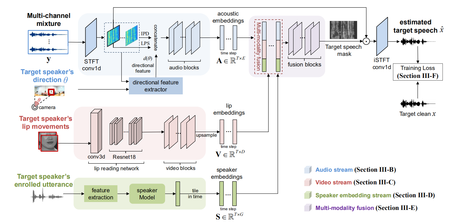 借鉴人类的听觉机制,该论文探索如何利用视觉-听觉(visual-audio)信息提升远场环境下的目标语音分离性能,提出一种通用的多模态目标语音分离框架。该框架利用目标说话人所有的可用信息,包括他/她的空间位置、嗓音特征和唇部运动,来分离目标说话人语音。在该框架下,该论文研究了多种多模态融合及建模方法,启发于语音识别领域因子分解层在快速环境适配中的进展,提出一种基于因子注意力的音视频融合方法,以聚合多模态高层语义信息。该方法通过将混合语音特征映射到多个声学信息子空间,利用来自其视觉模态的目标语音关联信息和基于可学习注意力机制对声学子空间信息进行有效选择和聚合。