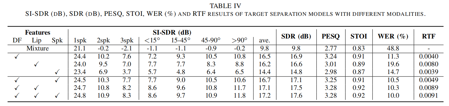 上表:在同框架下单模态、双模态和多模态语音分离系统性能比较