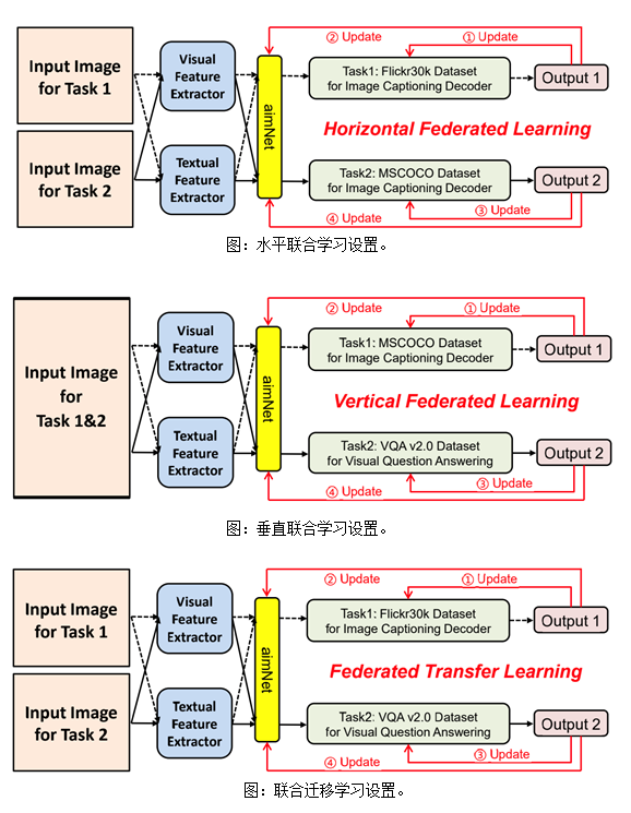 其中,对齐模块通过对提取的视觉和文本特征进行相互关注来构建对齐的图像表示,其能为显著图像区域提供了更清晰的语义描述。接下来,集成模块着重于通过自我注意机制集成视觉和文本特征,该机制捕获显著区域的分组和属性的搭配。最后,映射模块由两层非线性层组成,用于将学习到的细粒度图像表示映射到特定任务的特征域。各课题组提出的模块充分利用了图像中的所有有效信息,并将其作为输入传递给解码器,以生成有意义的句子或给出问题的准确答案。该课题组在两个图像字幕数据集和一个VQA数据集上,以及相应的三个联邦学习设置上,包括水平联合学习,垂直联合学习和联合迁移学习,进行实验用于验证该课题组的动机以及所提出方法的有效性。