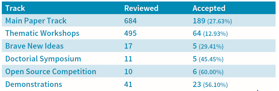 今年适逢25周年庆典,ACM Multimedia 2017大会于2017年10月23日至27日在美国加州山景城的计算机历史博物馆召开,共有700多名学者参加,本次大会的口号是 “Let's Make History!” 组织委员会公布的主会 (Main program) 的有关数据如下: