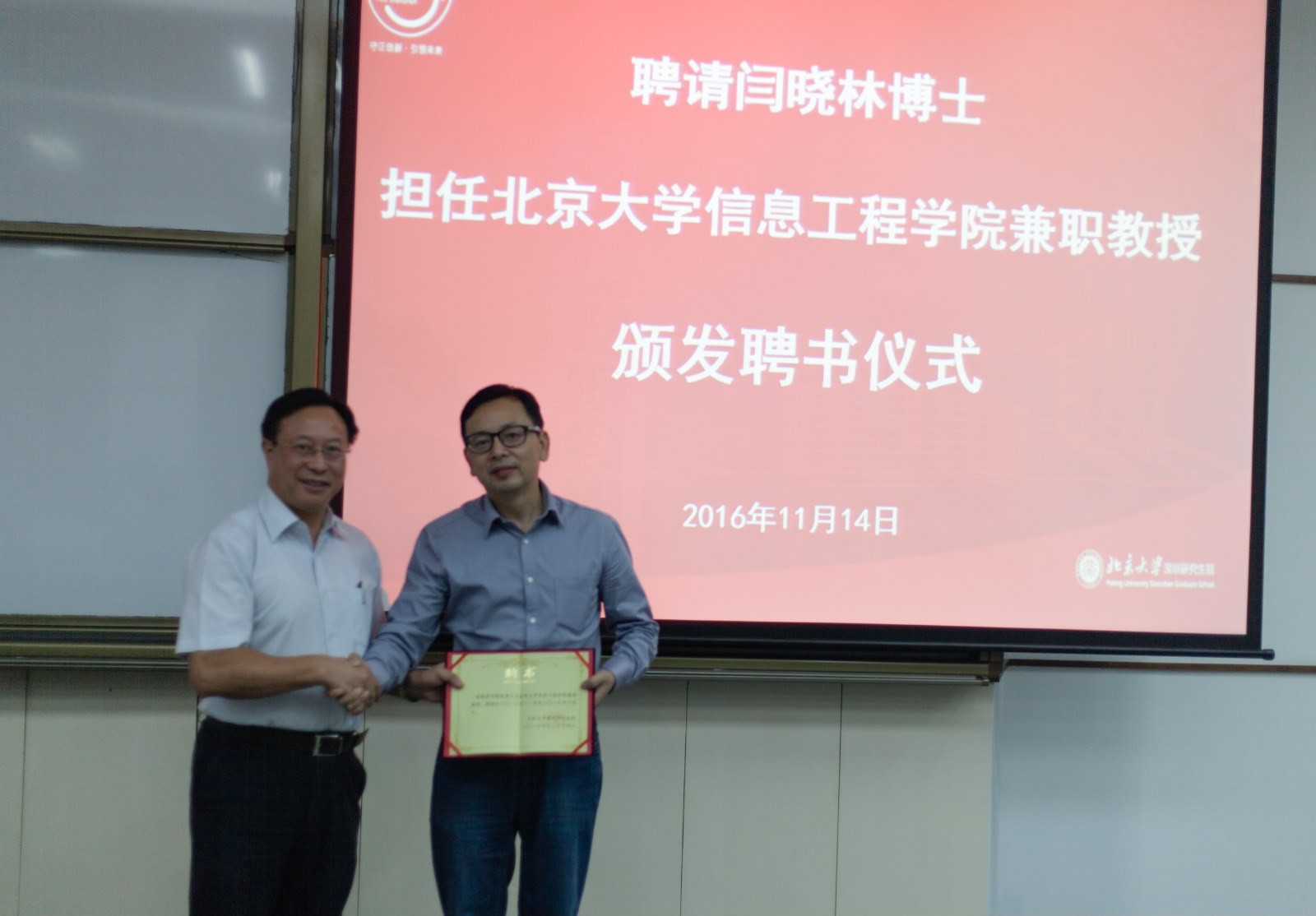 2016年11月14日下午四时,海角社区聘请TCL集团高级副总裁闫晓林博士担任海角社区 兼职教授的受聘仪式暨闫晓林博士学术报告会在C125报告厅举行。海角社区 深圳研究生院院长吴云东院士为闫晓林博士颁发了聘任书。海角社区 张盛东,朱跃生,张敏,周航,李倩、林新南及材料海角社区 孟鸿、化学海角社区 王勇等老师和部分同学参加了此次活动,另有来自TCL集团的嘉宾来及行业专家到活动现场。受聘仪式上,张盛东老师介绍了闫博士的学术成就和对显示行业的突出贡献。吴云东院长代表海角社区 感谢闫博士参与到海角社区 的学科建设和人才培养,并希望借此契机,加强我校与TCL的交流合作。与会老师和嘉宾在院长讲话结束之后合影留念。
