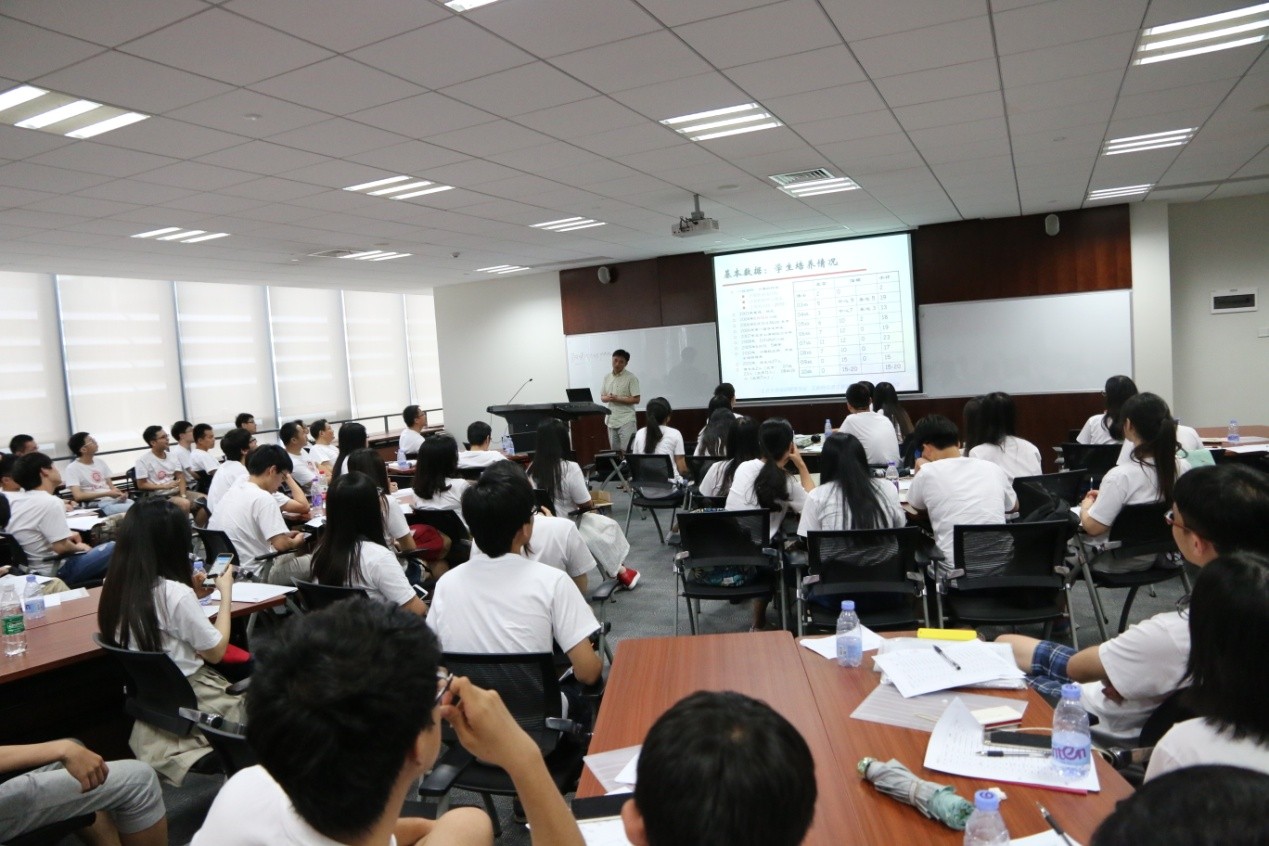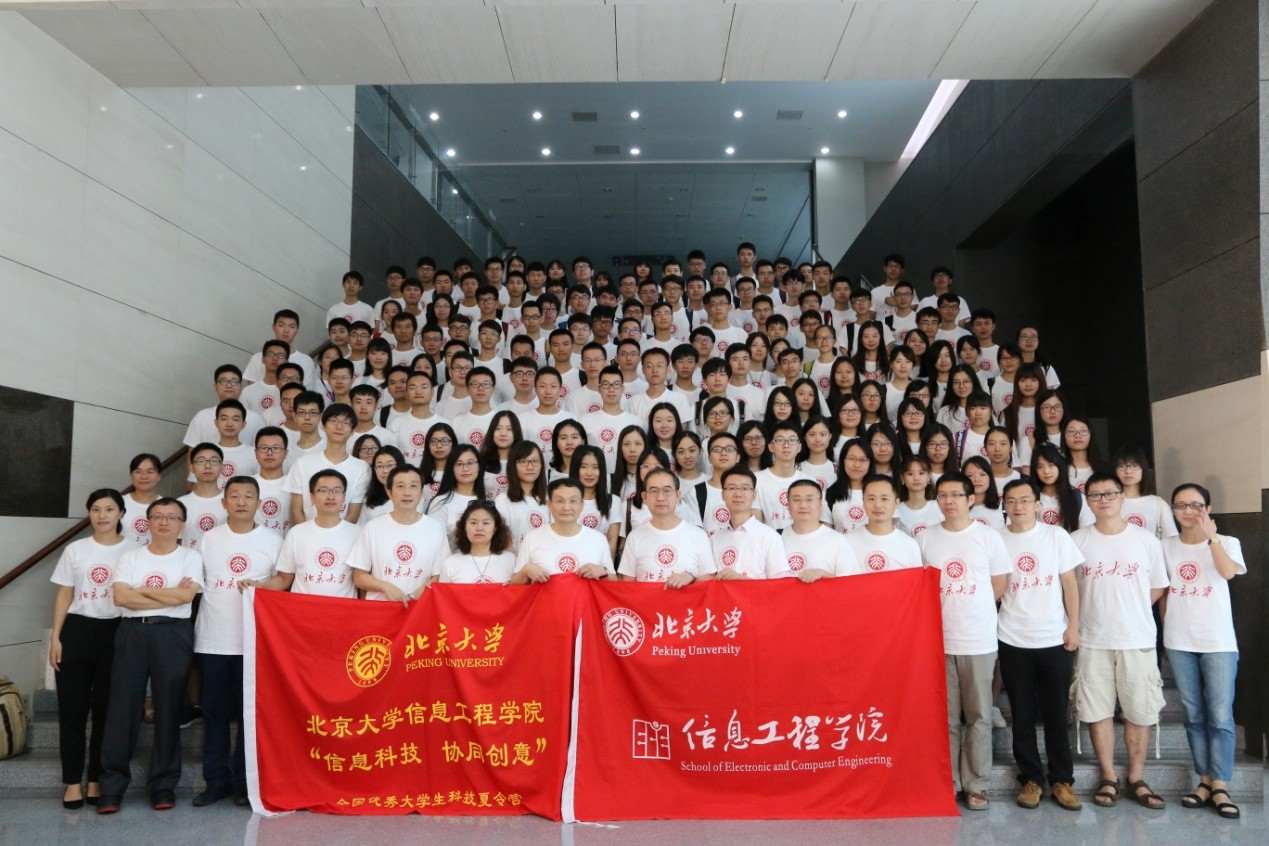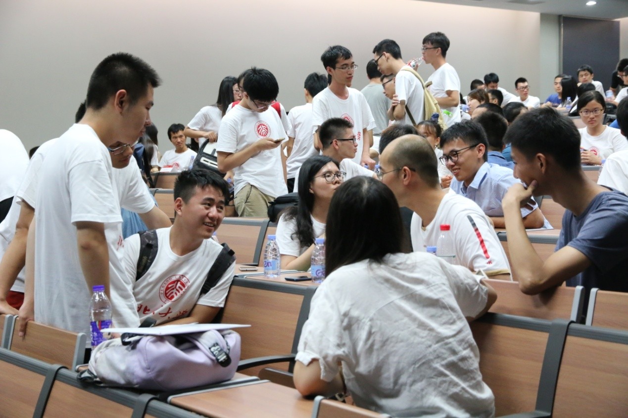 个专业有大致了解后,组织者先引导营员移步汇丰大楼一楼左侧楼梯拍大合照,然后再分别安排微电子专业和计算机专业的营员到不同的教室,听各专业老师对自己具体的研究方向进行详细的介绍。