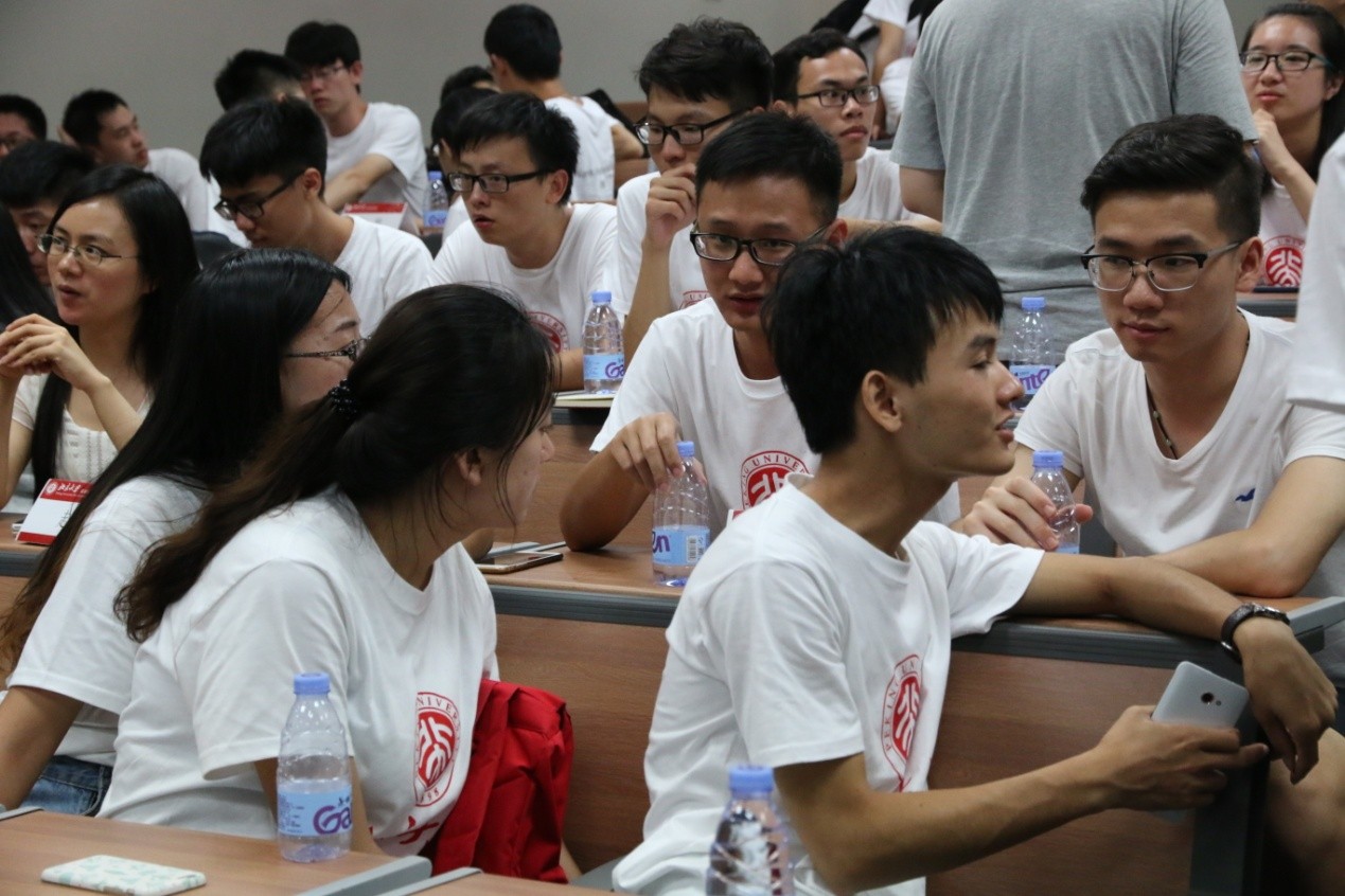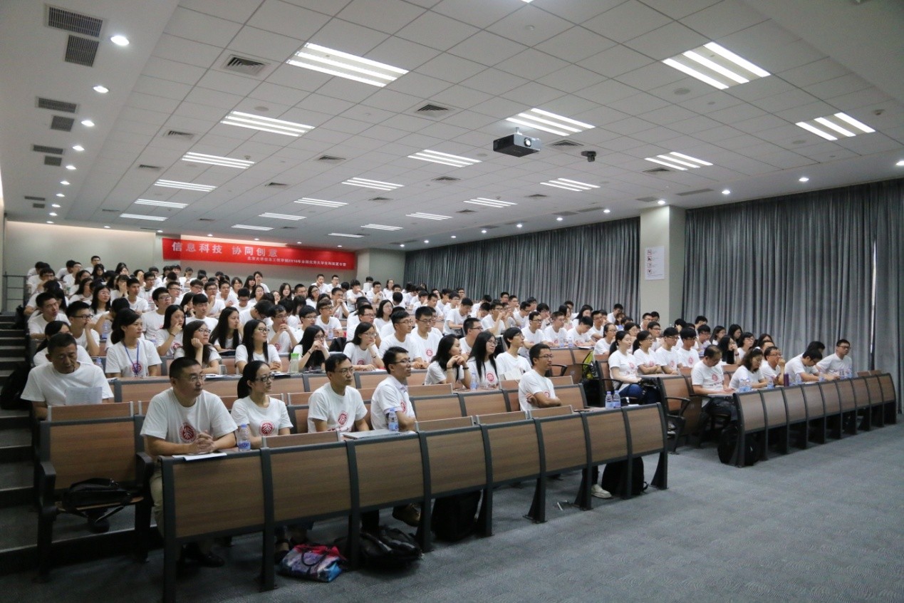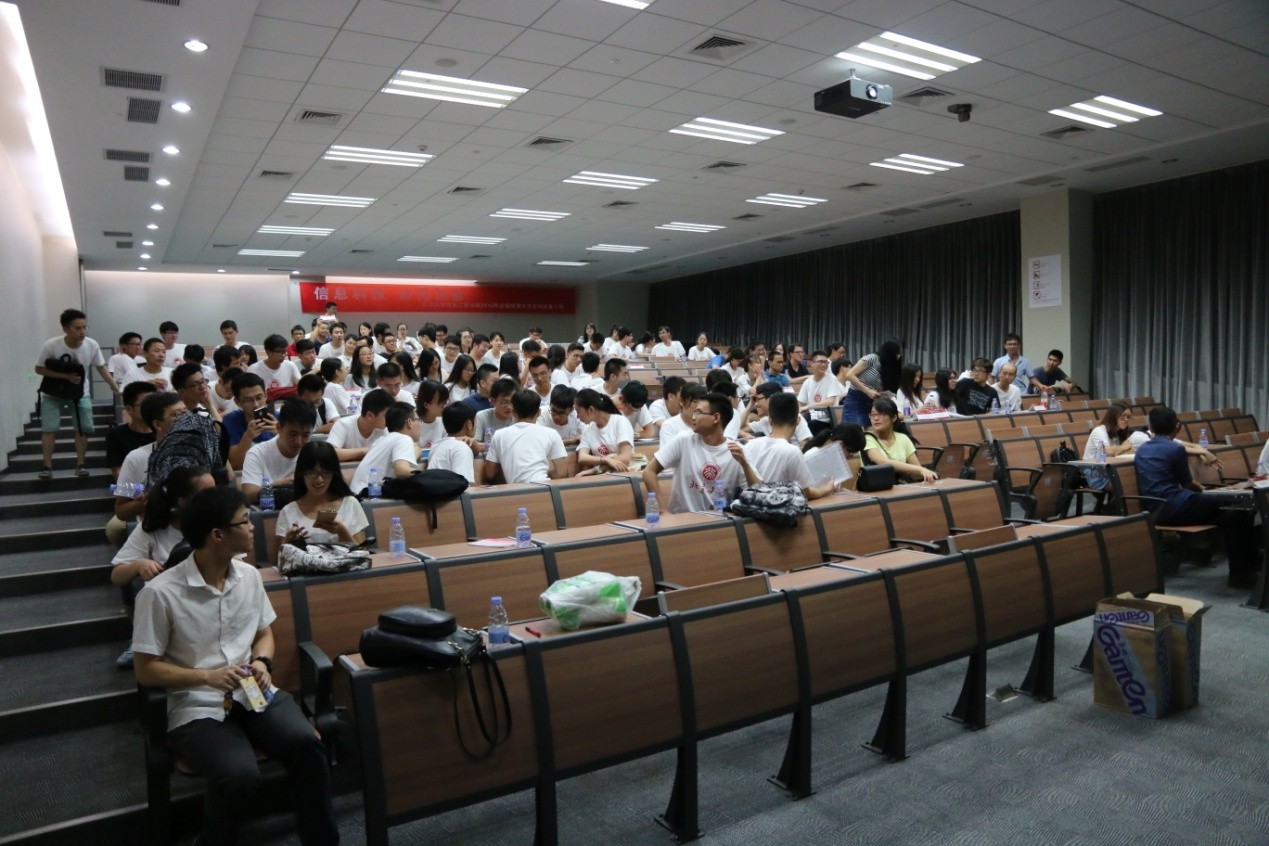 个专业有大致了解后,组织者先引导营员移步汇丰大楼一楼左侧楼梯拍大合照,然后再分别安排微电子专业和计算机专业的营员到不同的教室,听各专业老师对自己具体的研究方向进行详细的介绍。