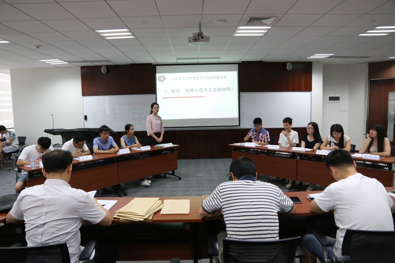 不同专业的营员各自分成八组进行辩论,计算机专业的辩论赛在汇丰商海角社区 大楼323教室进行,由王刚同学主持,微电子专业的辩论赛在汇丰商海角社区 大楼419教室进行,由崔小乐老师、蒲津川同学主持。辩题主要是跟专业相关的热点时事,比如“搜索引擎采用竞价排名是否合理”、“在校生创业是否会耽搁学业”、“数据挖掘会影响个人隐私吗”等等,对营员们来说是个不小的挑战。