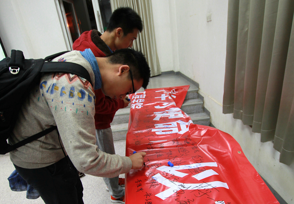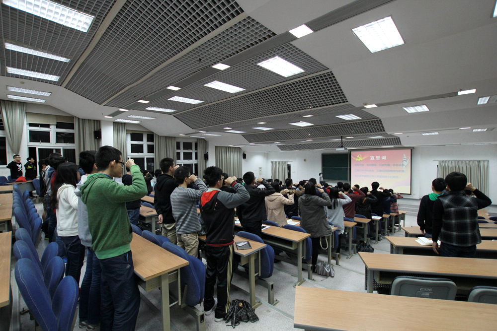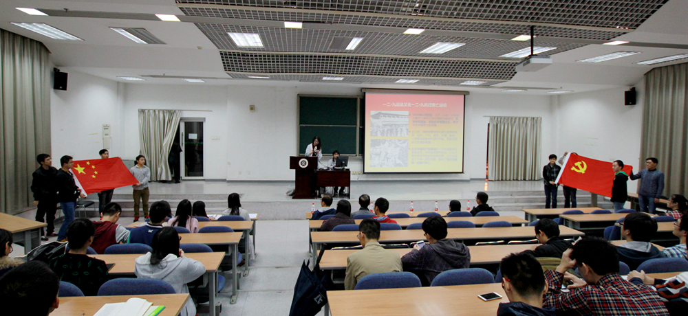 纪念活动主要环节包括“一二•九”运动背景介绍、爱国歌曲合唱、知识问答、集体宣读誓词四个环节。晚上7点整,八名旗手在迈着铿锵的步伐齐步护送国旗和党旗进场,庄重地站列在同学们面前。活动在老师同学们响亮的国歌声中开始。首先,师生们一同观看《百年中国》历史纪录片,对“一二•九”运动的背景及意义有了更加深入的理解。纪录片放映完毕后,群情激昂的同学们共唱一曲《歌唱祖国》,表达对“一二•九”运动中爱国学生的敬意。接下来主持人组织大家进行历史知识问答,通过对历史知识的讨论与切磋,同学们加深了对“一二•九”历史背景的理解。活动的最后,全体同学在卢志明老师的带领下共同宣誓,立志以振兴中华为使命,以重铸民族精神为职责。