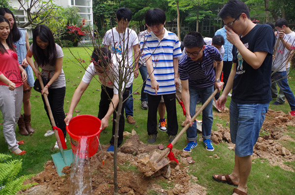 在A栋旁隆重举行主题为“留下学子情,带走腾飞梦”的毕业生植树活动。出席本次活动的有院长王文敏教授、副院长张盛东教授、院长助理雷凯、李震、李挥教授、行政办公室杨柳、卢志明等老师以及2011级的毕业生。活动分为植树、条幅签名、毕业许愿、纪念品领取四个部分。