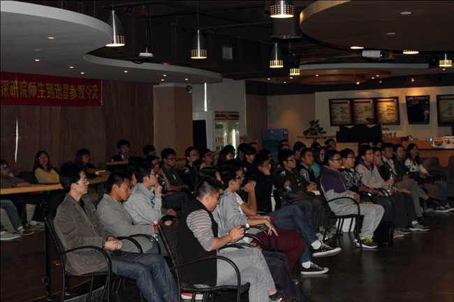 在公司软件园咖啡吧的分享交流会上,北大校友同时也是迅雷公司的高级副总裁段晖先生向师弟师妹们亲切讲述迅雷发展历程、迅雷文化、迅雷未来的发展战略和无限前景。从中了解到迅雷网络技术有限公司在短短3年时间内达到了500万的会员人数、年收入超6个亿,并有多个研究项目以及开发团队。迅雷网络技术有限公司的技术部、设计部等多个部门主管也分别向同学们分享了职场上的一些要求,给了同学们很大的启示。通过了解公司对IT技术的要求、团队合作的重要性、互联网行业的整体环境,使得同学们更加明确了将来的发展方向和所需的专业技术。这次的分享交流会,使学生们的知识面得到了很大的扩充。