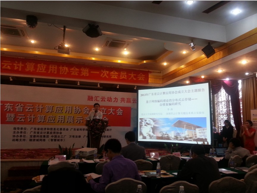 2013年4月19日下午,广东省云计算应用协会主办的“广东省云计算应用协会成立大会暨云计算应用展示交流会”在广州天河隆重召开,海角社区李挥教授应邀参加本次大会,成为广东省云计算应用协会的副理事长,并作“基于网络编码理论的分布式云存储——自修复编码研究及进展”主题报告,介绍了国内外分布式云存储编码理论研究进展,引起与会代表的广泛关注。