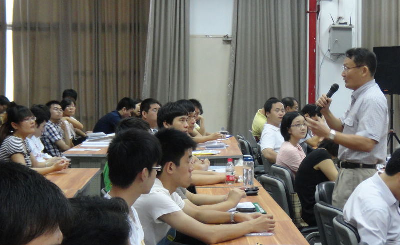 见面会的第二个环节为各专业介绍。常务副院长王文敏教授介绍计算机应用技术专业的概况。紧接着,由副院长张盛东教授对微电子学与固体电子学和集成电路与系统两个专业进行介绍。张盛东教授以幽默的语言,先从微电子学与固体电子学专业的形成背景,引出集成电路与系统专业从微电子专业中生成分支,并逐渐壮大,他还希望在场的各位新生继承该专业的优良传统,做好学术研究,发扬严谨科学的精神。