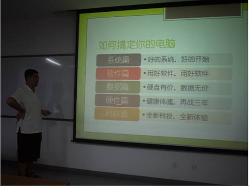 讲座特别邀请2011级计算机专业的沙文鹏同学为主讲人,沙文鹏同学是信息技术协会技术部部长,也是信息技术协会电脑维护活动的主要技术人员。他总结了自己维修电脑过程中见到同学们的问题,有针对性的向大家介绍了有关电脑维护方面的知识。沙同学主要从系统、软件、硬件、数据等方面展开讲解,生动形象地将同学们日常碰到的电脑问题及解决方法一一呈现在大家面前。