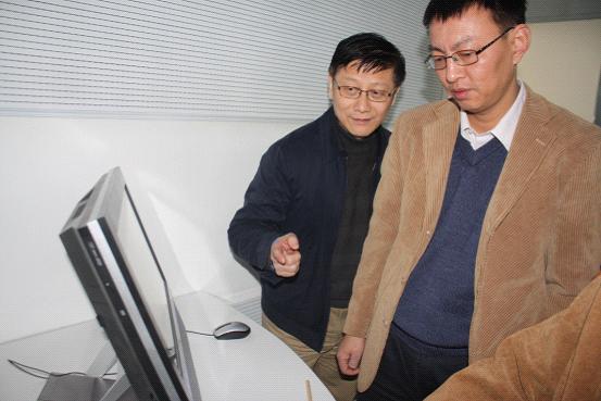 图四:李晓明教授给科工贸信委席卫忠处长介绍和演示“云媒体”展示系统