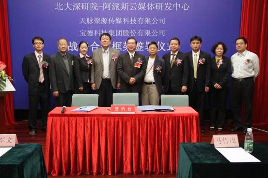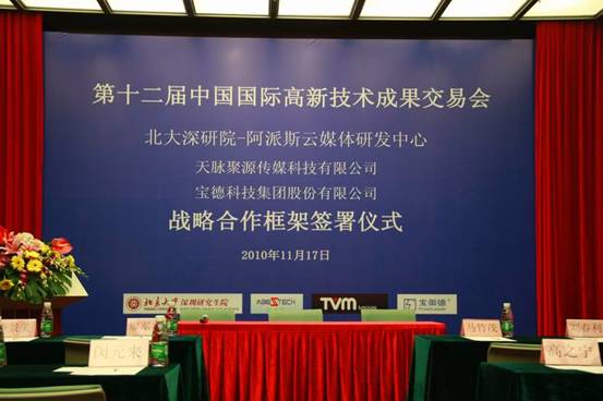 2010年11月17日下午,海角社区 深圳研究生院“深圳市云计算关键技术与应用重点实验室(组建)”、“海角社区 深圳研究生研院—阿派斯云媒体研发中心” 在第十二届中国国际高新技术成果交易会场馆五楼玫瑰一厅举行了与无锡天脉聚源科技有限公司、深圳宝德科技集团有限公司和北京天亚科创软件有限公司战略框架合作协议的签署仪式。签约各方就积极响应深圳互联网产业振兴发展规划(2009—2015年)【深府〔2009〕237号】,在云计算、云媒体、三网融合相关领域联合开展“政、产、学、研、用”的科技创新模式达成了积极、友好的战略合作意向。本次签约仪式得到了《大公报》、《南方日报》、《南方论刊》,“主流财富网”,“E800”等多家媒体和网站的现场采访和追踪报道。
