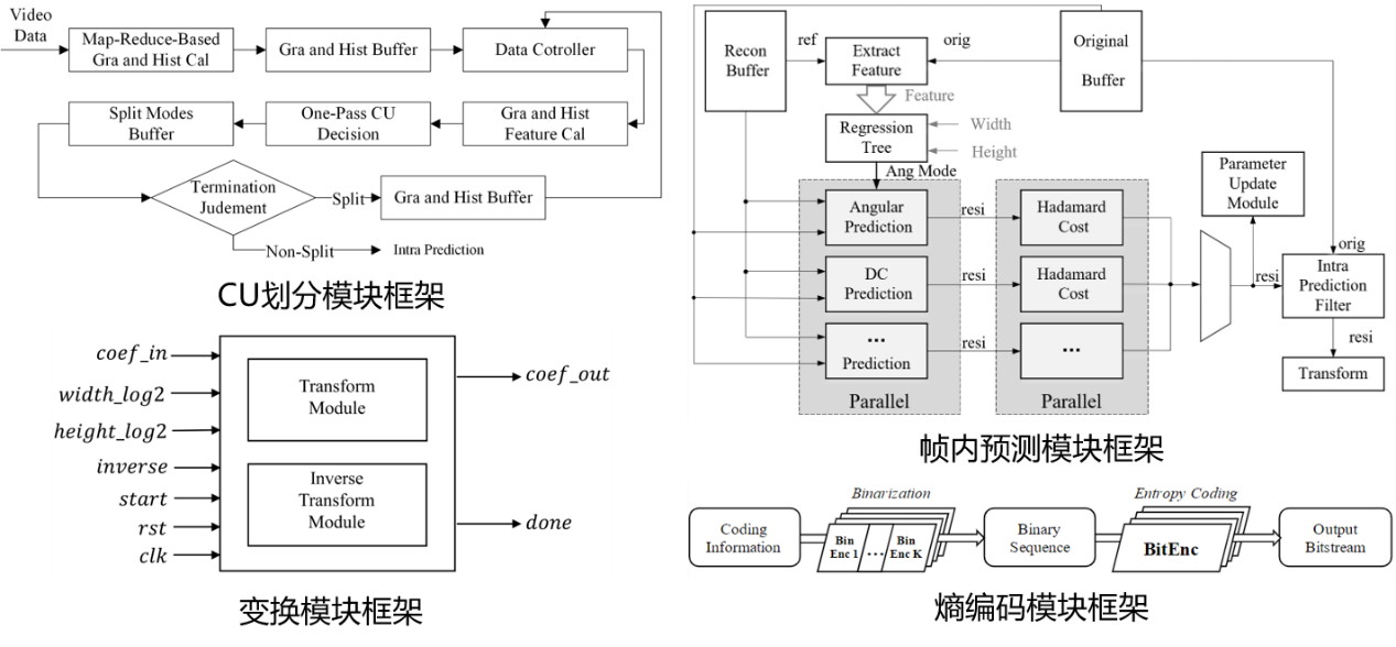 论文2:“OpenHardwareVC: An Open Source Library for 8K UHD Video Coding Hardware Implementation”主要用于应对具有我国自主知识产权的新一代音视频编码标准(AVS3,The Third-generation Audio Video Coding Standard)在硬件平台上实现8K(7680Í4320)超高清实时编码的挑战。8K超高清视频在硬件平台上的实时压缩是视频编码新标准的示范性应用。然而,新一代音视频编码标准AVS3中加入的众多编码工具大大增加了编码复杂性,严重阻碍了硬件编码器的高效实现。为了打破瓶颈,该文章提出了第一个用于8K超高清视频编码硬件实现的开源软件库OpenHardwareVC。基于对AVS3软件算法的分析,此库中提供了四个主要编码阶段的硬件加速设计,包括编码单元分区、内部预测、变换和熵编码。硬件仿真结果表明,基于该库中的软件描述模块可以轻松支持8K视频每秒30帧的实时压缩。该算法库的研发对超高清视频编码的硬件设计和系统实现具有重大意义,也有利于新编码标准的推广。目前OpenHardwareVC算法库已开源在OpenI启智社区//git.openi.org.cn/OpenHardwareVC。该论文通讯作者为高伟助理教授,海角社区 为第一作者单位,AVS3hi 8K硬件FPGA项目组全体同学为共同作者(包括:博士生袁航、硕士生郭洋、硕士生陶履方和硕士生蔡占元等),合作者还包括海角社区 李革教授。