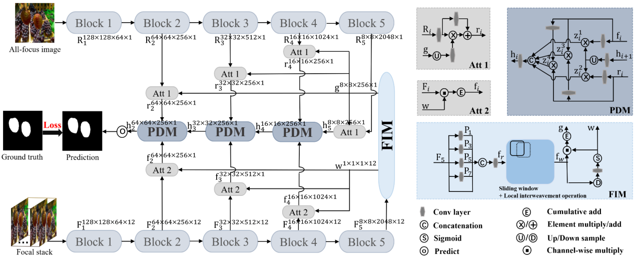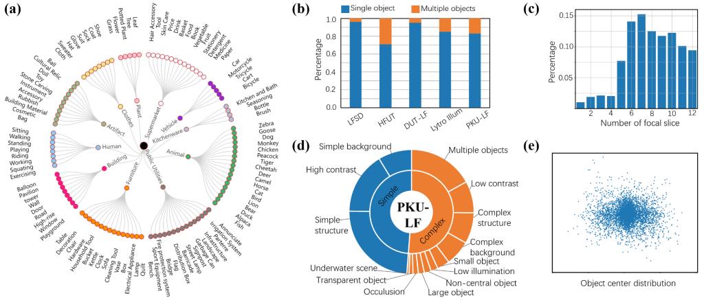 论文2:“A Thorough Benchmark and A New Model for Light Field Saliency Detection”重点讨论了基于光场的图像分割的数据集和相关技术。与现有的RGB或者RGB-D显著性检测数据集相比,用于光场显著性检测的数据集往往存在数据量多样性不足、数据格式不完整、标签粗糙等诸多缺陷,从而阻碍了该领域的发展。为了解决这些问题,我们精心构建了一个名为PKU-LF的大规模光场数据集,它包含了5000个光场样本,涵盖了各种室内外场景。我们的PKU-LF提供了包罗万象的光场数据格式,并提供了一个统一的平台来比较使用了不同光场格式的算法。为了激发显著性目标检测任务的新活力,我们提拱了许多未被探究的场景(例如水下和高分辨率场景)和最丰富的标注(例如涂鸦标注、边界框、对象/实例级标注和边缘标注),基于这些数据可以研究许多潜在的注意力建模任务。为了促进显著性检测任务的发展,我们在四个现有数据集以及所提出的数据集上系统地评估和分析了16种具有代表性的2D、3D和4D方法,提供了一个全面的基准。此外,针对光场的独特结构特征,我们提出了一种新颖的对称双流架构网络以更准确地预测光场的显著性。具体来说,我们的模型包含了焦点交织模块和三个部分解码器模块。前者旨在有效地建立跨焦点切片的长距离依赖,而后者旨在以相互增强的方式有效地聚合提取的特征。大量实验表明我们的方法明显优于已有的方法。项目开源地址:。