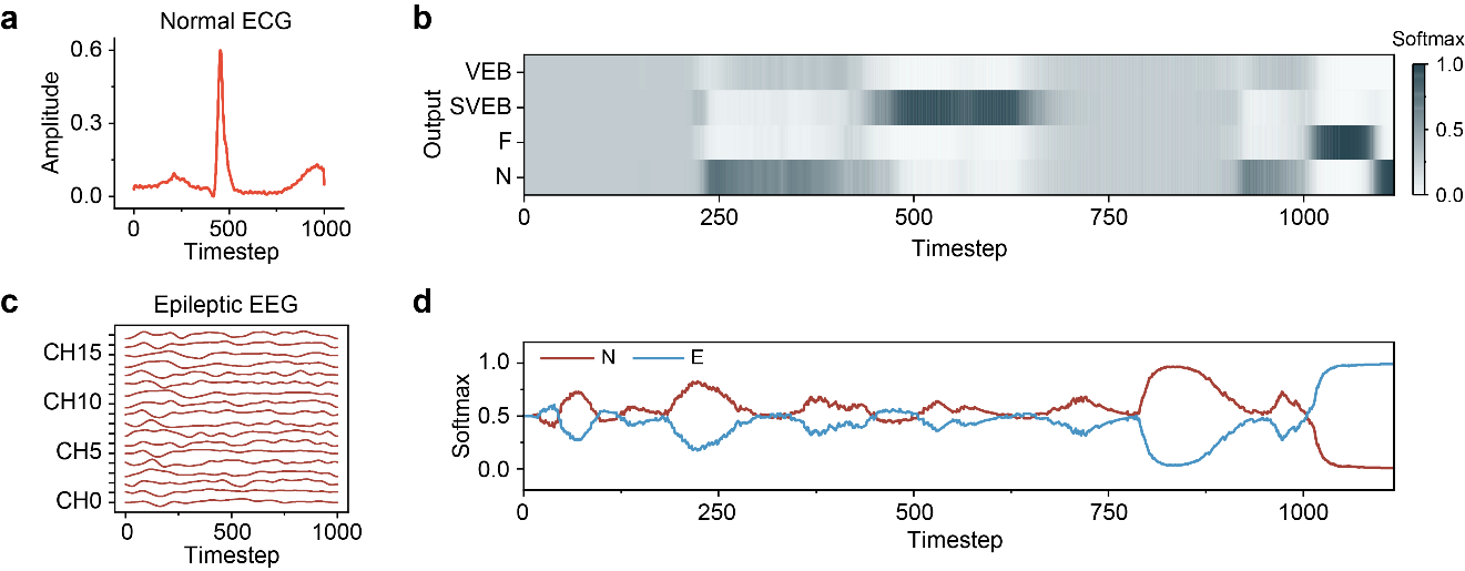 进一步地,该团队利用上述两大模块构建了神经形态生理信号检测系统,其中生理信号经过异步脉冲编码器编码为脉冲序列,再输入到LSNN中进行分类。该系统在心律失常分类和癫痫检测任务中分别达到了95.83% 和99.79%的准确率,并且由于该系统具有强大的计算能力,因此所需的网络规模也大幅度地减小了。本项研究为实现高效的神经形态生理信号检测系统提供了一种可靠且具有颇大潜力的方案,有望推动下一代人机交互界面的蓬勃发展。