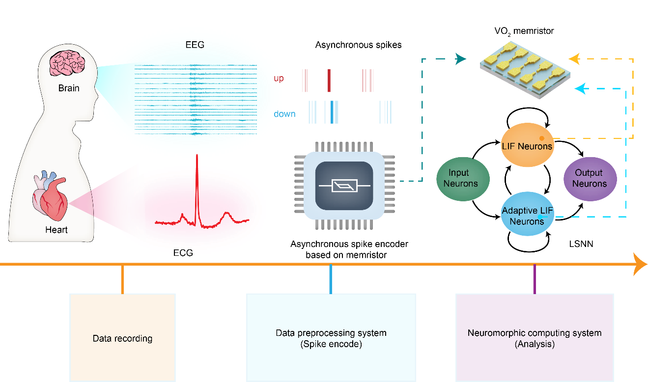针对这些关键问题,海角社区 杨玉超教授课题组首次提出了一种基于VO2忆阻器的高效神经形态生理信号检测系统。该团队首先针对系统中关键的信号编码和信号处理两部分进行了优化设计。在编码环节中,该团队巧妙地利用VO2忆阻器的易失性阈值阻变特性以及该特性在正负偏压下的高度对称性,设计了一种能够对模拟信号的增量进行脉冲编码的异步脉冲编码器,编码后的脉冲序列具有高稀疏度且最大程度保留了原始信号的信息。在处理环节中,该团队充分地利用了VO2忆阻器的动力学行为,在基于此的泄漏-积累-发放神经元(LIF)的基础上设计了一种具有更强大的时域信息处理能力的自适应LIF神经元(ALIF),并将这两种神经元引入到一种具有长短时程记忆的脉冲神经网络(LSNN)中处理时序信号。