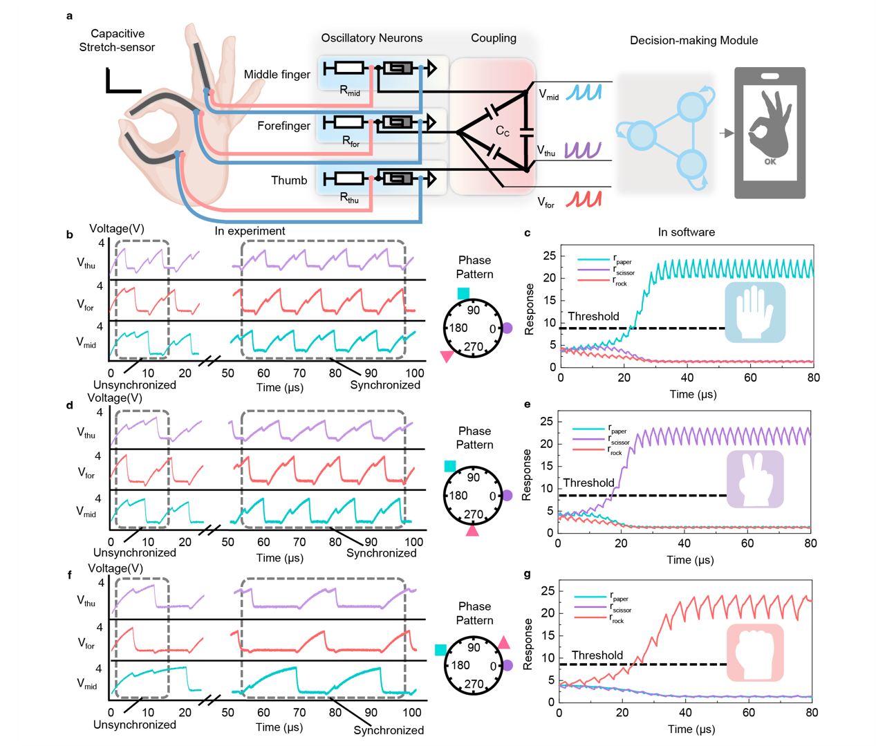针对领域关键需求与挑战,海角社区 杨玉超教授课题组首次硬件实现了电容耦合的VO2相变振荡动力学计算系统。传感数据遵循分层处理原则,包括传感预处理(编码、过滤和特征增强)到后处理(识别、分类和定位)。针对预处理模块,团队首先制备出具有高度均一性的氧化钒忆阻器件,并基于此构建具有传感功能的VO2振荡器。进一步利用电容电路耦合多个VO2振荡器构建出同步动力学特征,其中,信息被编码在同步后的相位差中。该耦合VO2振荡器网络用于构建传感预处理的连续时间动态系统,具有极低的能量延迟积。在后处理模块中,团队针对耦合振荡器连续时间输出的特征设计了具有高选择特异性的决策网络模块,从而构建出完整的动态传感与处理的计算系统。硬件实验结果证明了耦合网络在触摸识别和手势识别等感官处理任务中表现出色,相比传统的硬件实现在器件数目和能量延迟积等方面具有显著优势。