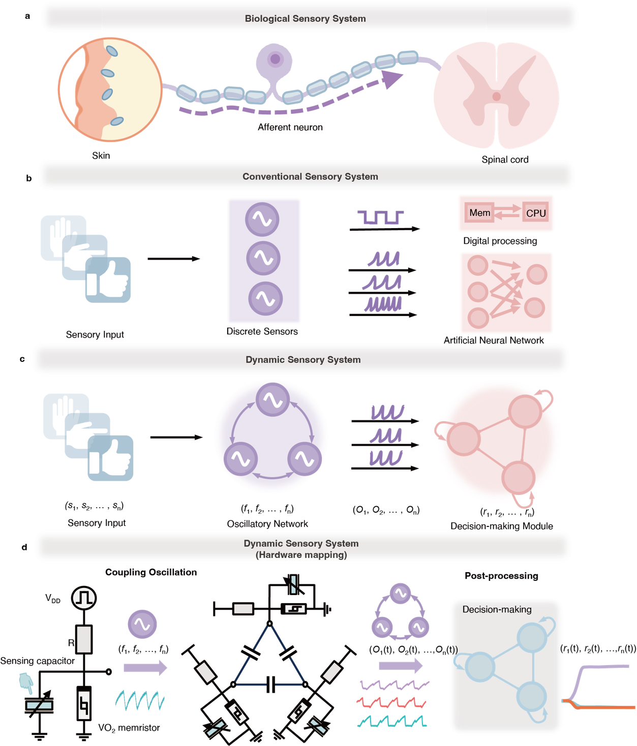 传统电路元件在处理外界物理信号时存在面积和效率的瓶颈,而新兴的忆阻器件具备丰富的内禀非线性动力学,这类器件底层的物理动力学带来了全新的计算资源,是产生自底向上智能涌现的关键。其中,具有时空耦合特性的莫特忆阻器及其耦合振荡动力学能够实现复杂且可控的群体动力学行为,从而能够实现对复杂传感信号的处理。这样一种新的计算系统有望最大限度地减少传感器和处理单元之间的冗余数据移动,满足可穿戴电子设备、虚拟现实等技术对于先进的传感系统在速度、面积和能效方面需求。
