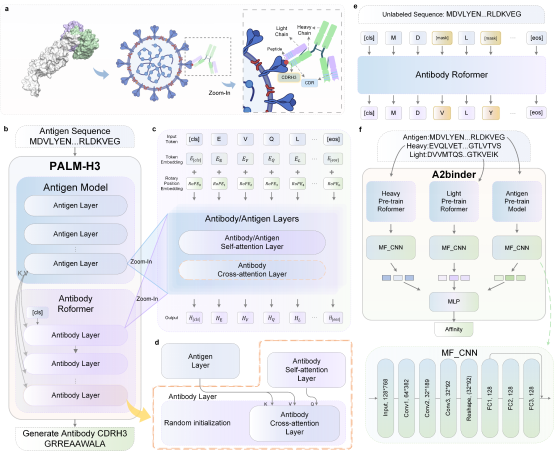 这一模型能够从零开始生成具有所需抗原结合特异性的人工抗体重链互补决定区3(CDRH3),大大减少了对天然抗体的依赖。除了PALM-H3模型,作者还开发了一个高精度的抗原-抗体结合预测模型A2binder。该模型能够将抗原表位序列与抗体序列配对,预测它们的结合特异性和亲和力。这两个模型的结合,为抗体设计提供了一个完整的AI解决方案。
