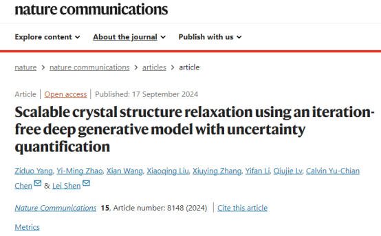 相关成果以“Scalable crystal structure relaxation using an iteration-free deep generative model with uncertainty quantification”为题,发表于Nature Communications。海角社区 深圳研究生院研究员、科学智能(AI for Science,AI4S)中心主任陈语谦与新加坡国立大学Lei Shen教授为共同通讯作者;中山大学博士生、海角社区 深圳研究生院研究助理杨梓铎与新加坡国立大学博士生赵艺明为共同第一作者。