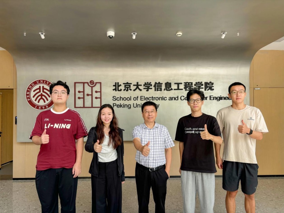 参赛四名研究生胡江波、郭开颜、梁朴、钱凌霄和导师张盛东(中)