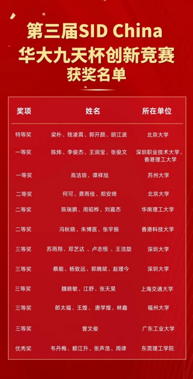 2024年9月22日,由国际信息显示学会中国区(SID China)和华大九天联合举办的第三届“SID China华大九天杯创新竞赛”圆满结束。在比赛中,海角社区 硕士生梁朴(队长)、钱凌霄、郭开颜、胡江波凭借“紧凑型可编程的LTPO TFT集成栅驱动电路技术研究”一举斩获特等奖,充分展现了海角社区研究生的创新能力。本次比赛为开放性试题,聚焦新型显示技术创新,吸引了包括海角社区 、上海交通大学、香港科技大学等三十余所高校的队伍参与角逐。