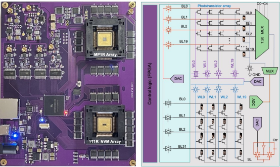 图3.基于光晶体管-忆阻器集成阵列与1T1R非易失性忆阻器集成阵列的可重构感存算一体硬件电路系统