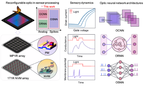 近日,海角社区 /广东省存算一体芯片重点实验室-杨玉超教授团队在Nature Electronics杂志上发表了题为《Reconfigurable in-sensor processing based on a multi-phototransistor-one-memristor array》的研究论文,在可重构感存算一体集成阵列与硬件系统取得重要进展。针对现有忆阻器视觉感知神经形态器件在动力学特性和编码功能上的局限以及集成硬件系统算法兼容性不足的问题,首次提出将莫特氧化物异质结结构忆阻器与光晶体管集成,构建了支持多种光图像编码功能的可重构硬件系统。这一系统能够实现光图像的时空、模拟与脉冲编码,并兼容生物启发式和机器学习架构的多种算法,通过与非易失性忆阻器阵列集成可支持多种光学神经网络(如光学卷积神经网络、循环神经网络、脉冲神经网络),从而执行多种计算视觉任务,包括识别静态、运动和彩色图像识别功能,为实现大规模可重构视觉计算硬件系统奠定了关键基础。