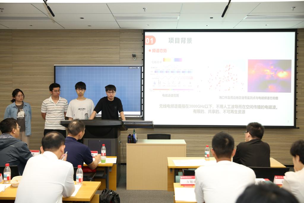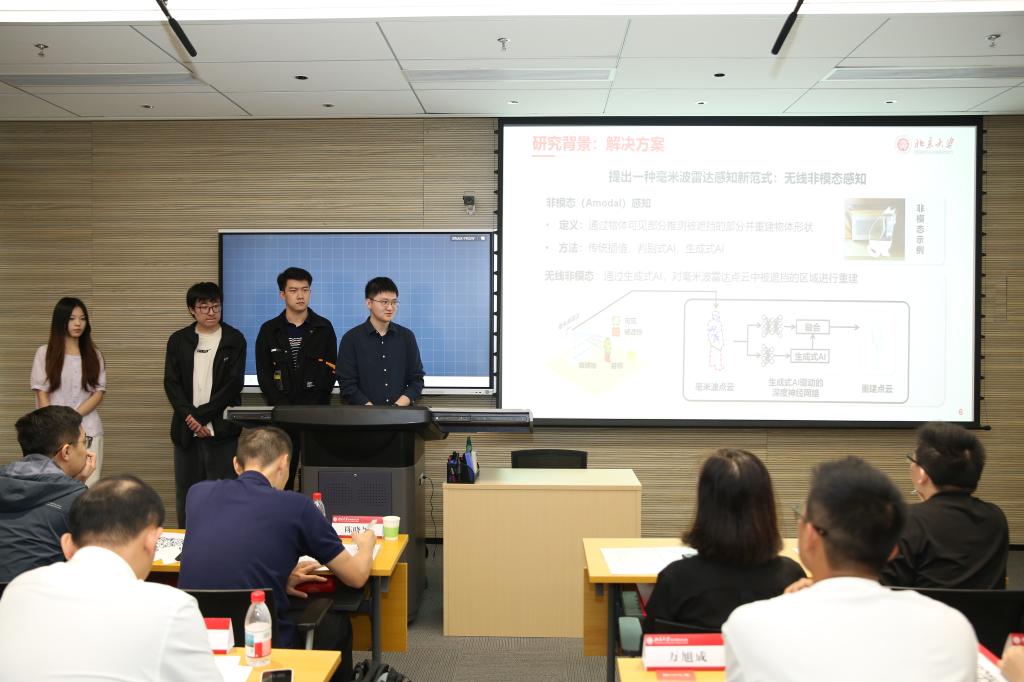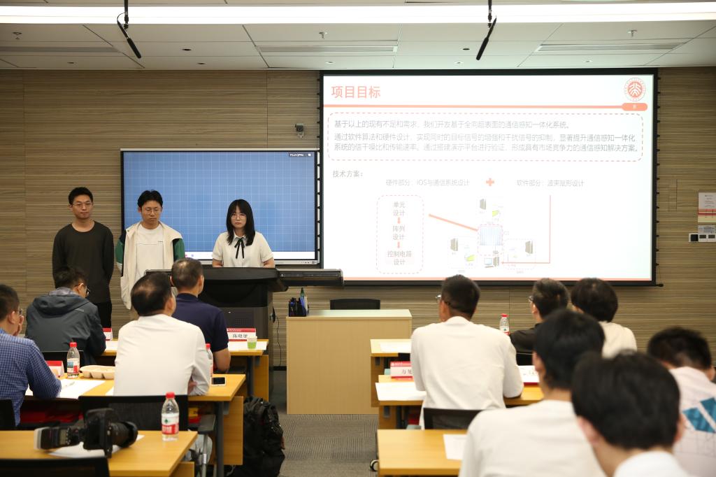 在下半场的参赛项目展示环节中,邵帅、程璐、范博皓、刘志远的参赛项目《基于稀疏采样的端边云协同频谱态势认知系统》针对频谱资源紧张困境及感知数据稀疏性瓶颈,构建“端边云”协同频谱态势感知架构,解决现有方法在极稀疏采样下无法完成细粒度频谱态势感知任务,为6G智慧通信中频谱资源管理与分配提供支持。王钰涵、徐卓成、岳禹彤、李天乐的参赛项目《基于可重构全向超表面的通信感知一体化系统》旨在开发一种基于可重构全向超表面的通信感知一体化系统(ISAC)提升通信和感知的抗干扰能力与传输效率。张粟桐、郭春宇、贾楠芊、孙泽垚的项目《基于生成式AI的无线非模态感知装置》旨在解决传统毫米波雷达在复杂遮挡环境下的感知局限性,提升无线感知系统在自动驾驶、智能家居和物联网等场景的感知精度。评委们对每个项目都进行了深入的提问和专业的点评,为学生们提供了宝贵的反馈和建议。