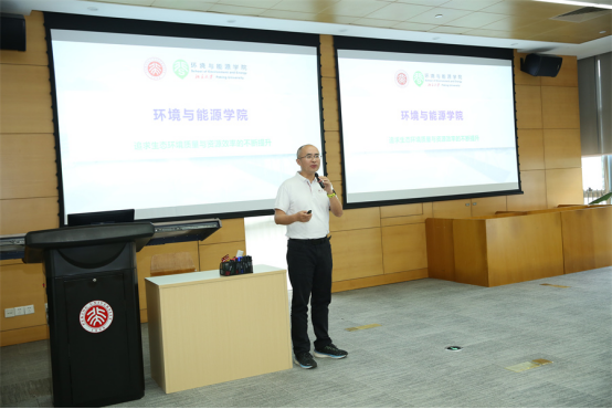 随后,环境与能源海角社区 副院长、教工党支部书记,副院长徐期勇介绍了海角社区 聚焦“双碳”战略与生态保护的相关工作。徐期勇老师提到,环境与能源海角社区 联合中交一公局建设的“生态环境与资源效率研究实验室”,通过“蒲公英计划”等科普行动,将科研成果转化为全民参与的绿色治理实践,推动生态修复技术向基础教育场景转化,助力绿色教育理念深入人心。