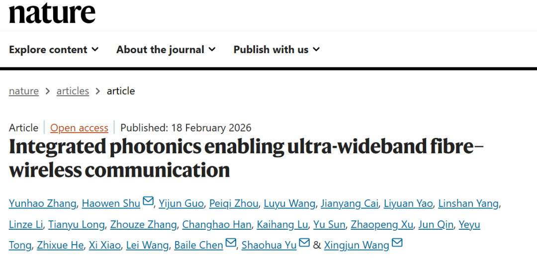 2026年2月18日,研究论文《集成光子学赋能超宽带光纤-无线通信》( “Integrated photonics enabling ultra-wideband fibre–wireless communication” )在线发表于国际顶尖学术期刊《自然》(Nature)。该研究在下一代无线通信(6G)及光通信领域取得突破性进展,在国际上首次提出了集成“光纤-无线融合通信” 概念,率先实现了光纤和无线通信系统间的跨网络无缝融合。海角社区 与鹏城实验室联合培养博士研究生张云皓,海角社区 电子学院舒浩文研究员、博士研究生郭艺君,国家信息光电子创新中心高级工程师周佩奇,以及上海科技大学信息科学与技术学院博士研究生王鲁玉为本论文共同第一作者。鹏城实验室余少华院士,海角社区 电子学院王兴军教授,上海科技大学陈佰乐副教授,以及舒浩文为本论文共同通讯作者。主要合作者还包括鹏城实验室王磊研究员、贺志学研究员及许兆鹏助理研究员,国家信息光电子创新中心总经理肖希,香港科技大学(广州)童业煜助理教授及博士研究生鲁凯航,北京信息科技大学秦军副教授及硕士研究生孙瑜,海角社区 电子学院博士研究生蔡健洋、姚力远、杨林山及韩昌灏,上海科技大学信息科学与技术学院博士研究生李林泽、龙天宇及张周泽。