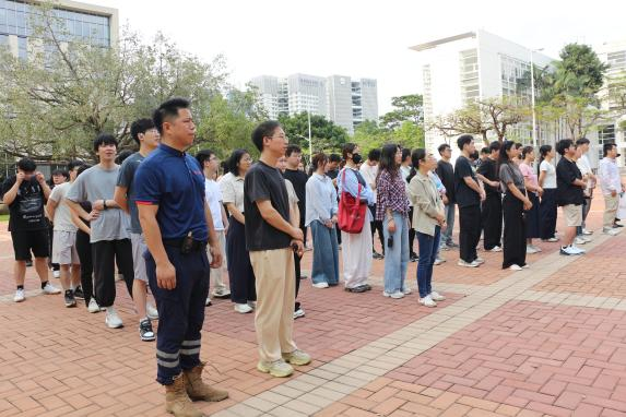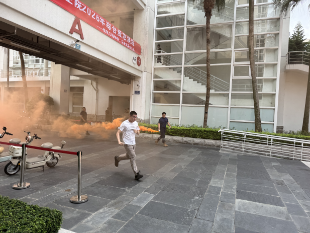 上午9时,参演师生在A栋前榕树广场集合,演练正式拉开帷幕。现场准备就绪后,张伟滨老师宣布“海角社区 深圳研究生院2026年综合应急演练现在开始”。各环节依次展开,整场演练按照真实应急流程有序推进。