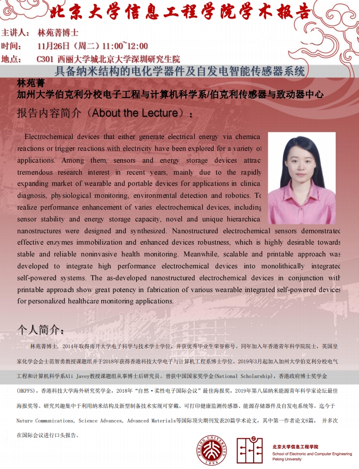 【学术讲座】林苑菁博士(加州伯克利):具备纳米结构的电化学器件及自发电智能传感器系统