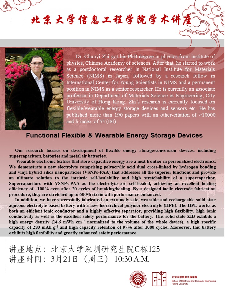 【学术讲座】支春义教授(香港城市大学):Functional Flexible & Wearable energy storage Devices
