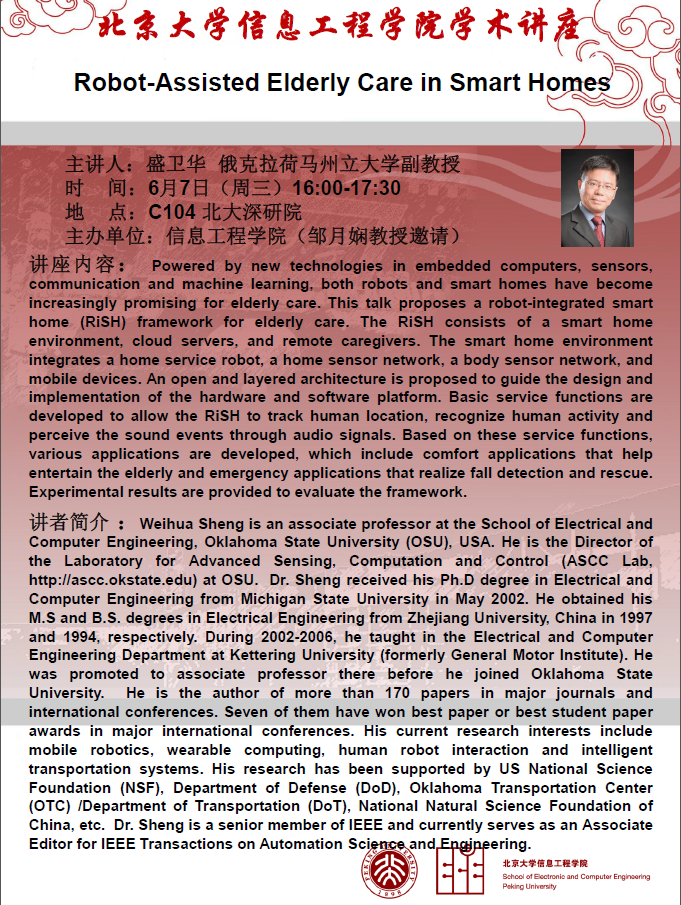 【学术讲座】盛卫华副教授(俄克拉荷马州立大学):Robot-Assisted Elderly Care in Smart Homes