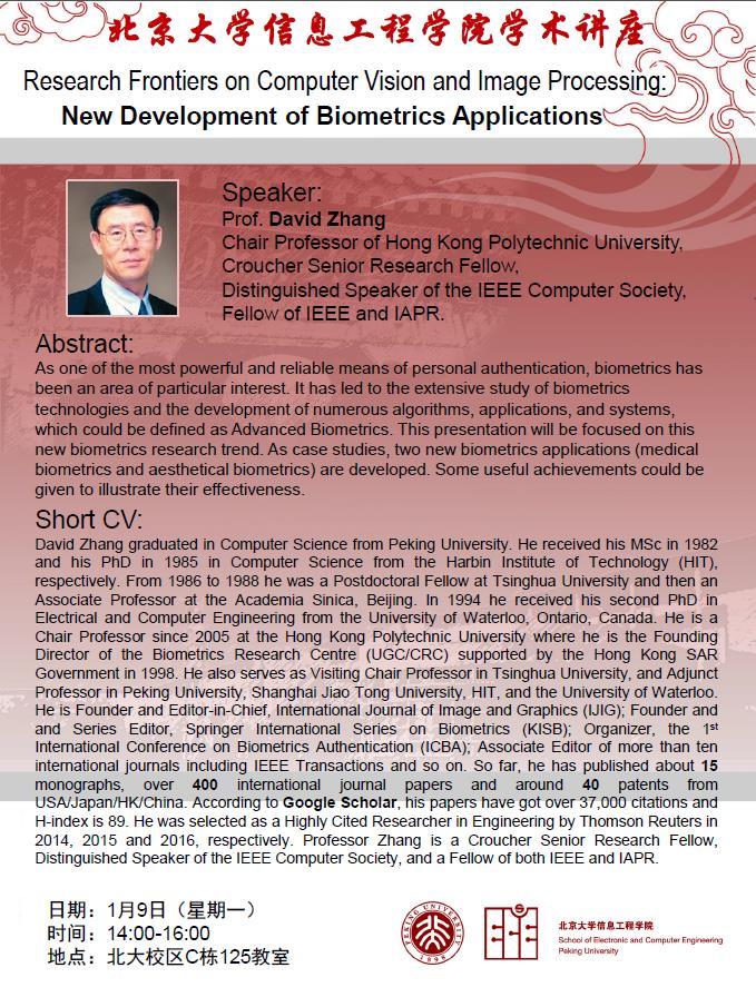 【学术讲座】Prof. David Zhang( Chair Professor of Hong Kong Polytechnic University):Research Frontiers on Computer Vision and Image Proce