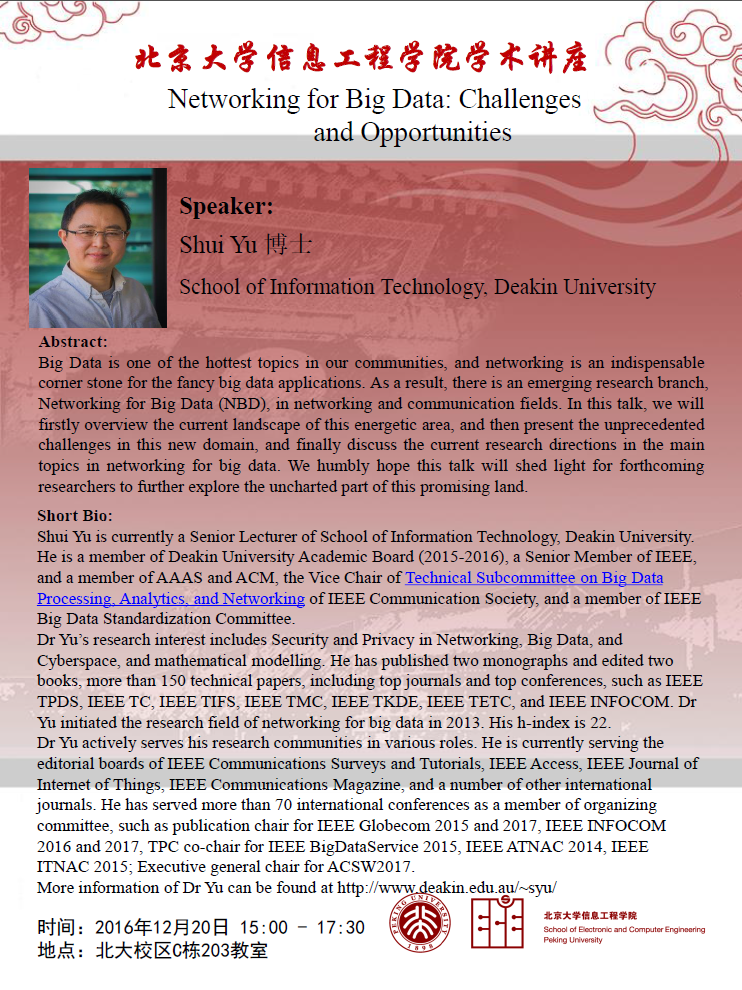 【学术讲座】 ShuiYu 博士 School of Information Technology, Deakin University:Networking for Big Data: Challenges and Opportunities