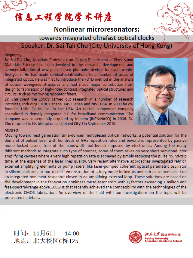 【学术讲座】Sai Tak Chu副教授(CityU):Nonlinear microresonators: towards integrated ultrafast optical clocks