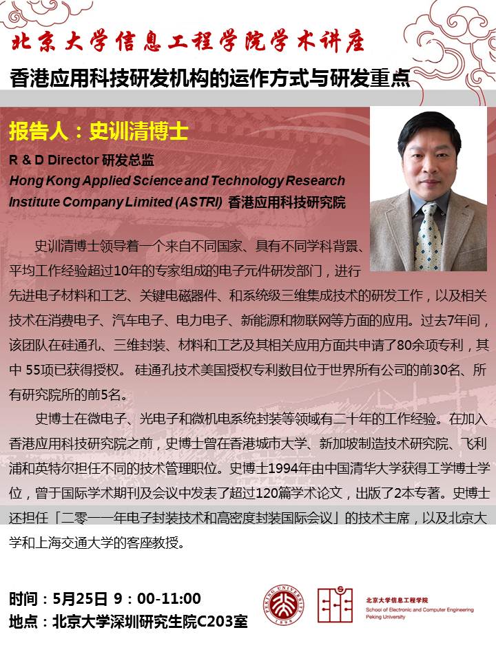【学术讲座】史训清博士(香港应用科技研究院 研发总监):香港应用科技研发机构的运作方式与研发重点