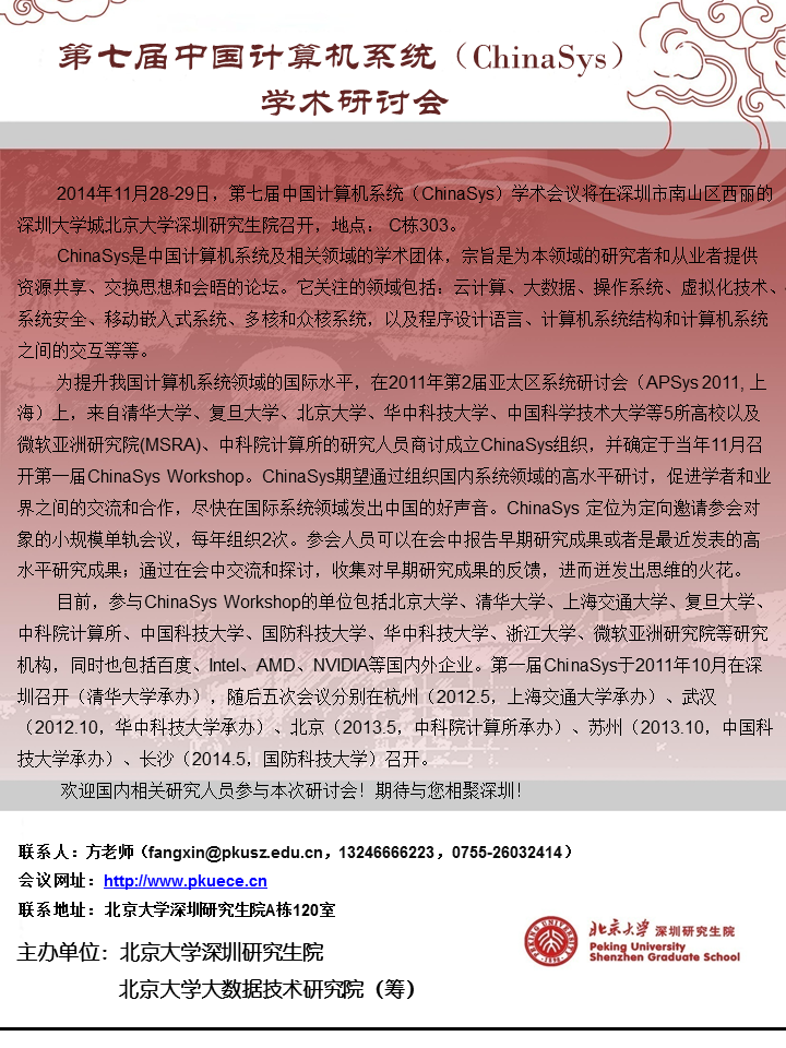 【学术会议预告】:第七届中国计算机系统(ChinaSys)学术研讨会