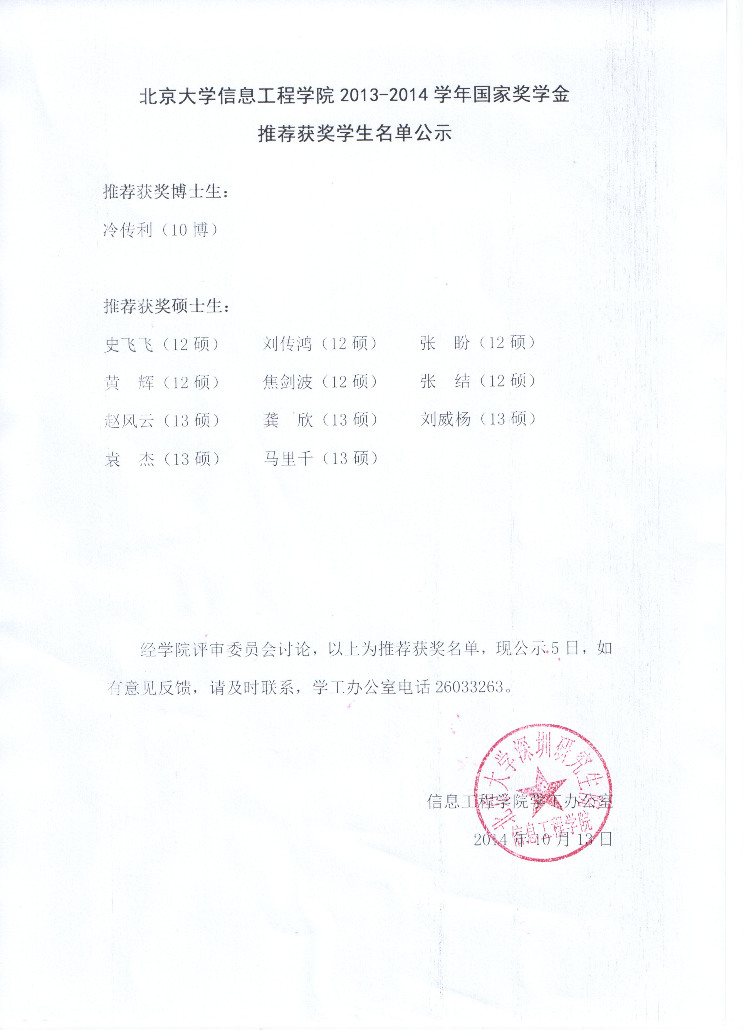 海角社区 2013-2014学年国家奖学金推荐获奖学生名单公示