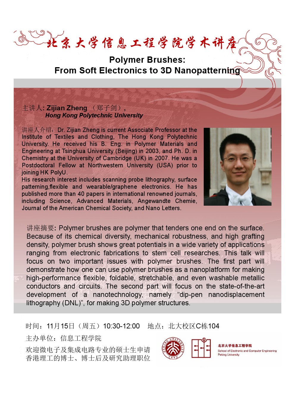 【学术讲座】Dr.Zijian Zheng:Polymer Brushes: From Soft Electronics to 3D Nanopatterning