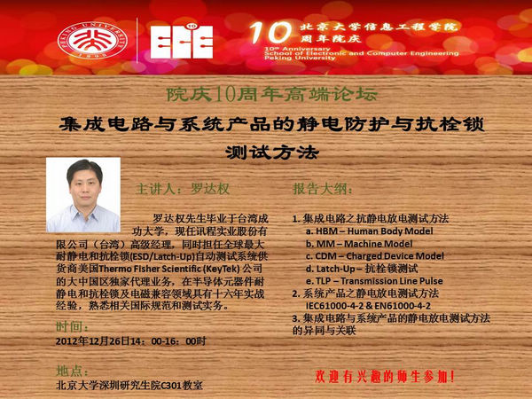 【海角社区 院庆十周年系列讲座】罗达权经理:集成电路与系统产品的静电防护与抗栓锁测试方法