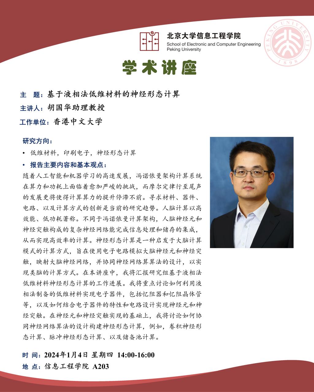 讲座 | 预告 基于液相法低维材料的神经形态计算