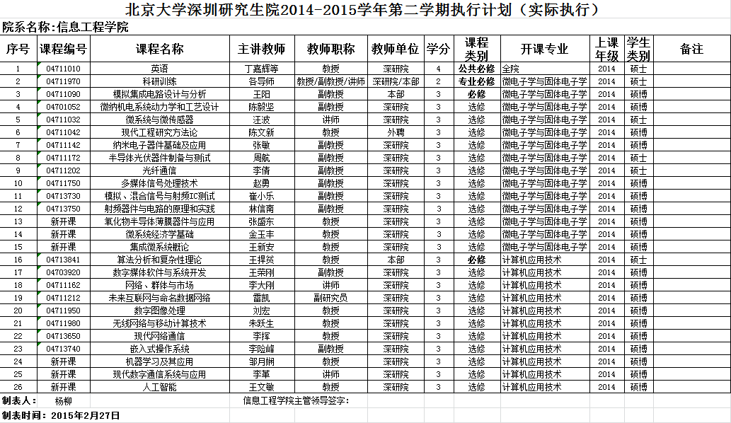 海角社区 深圳研究生院2014-2015学年第二学期执行计划